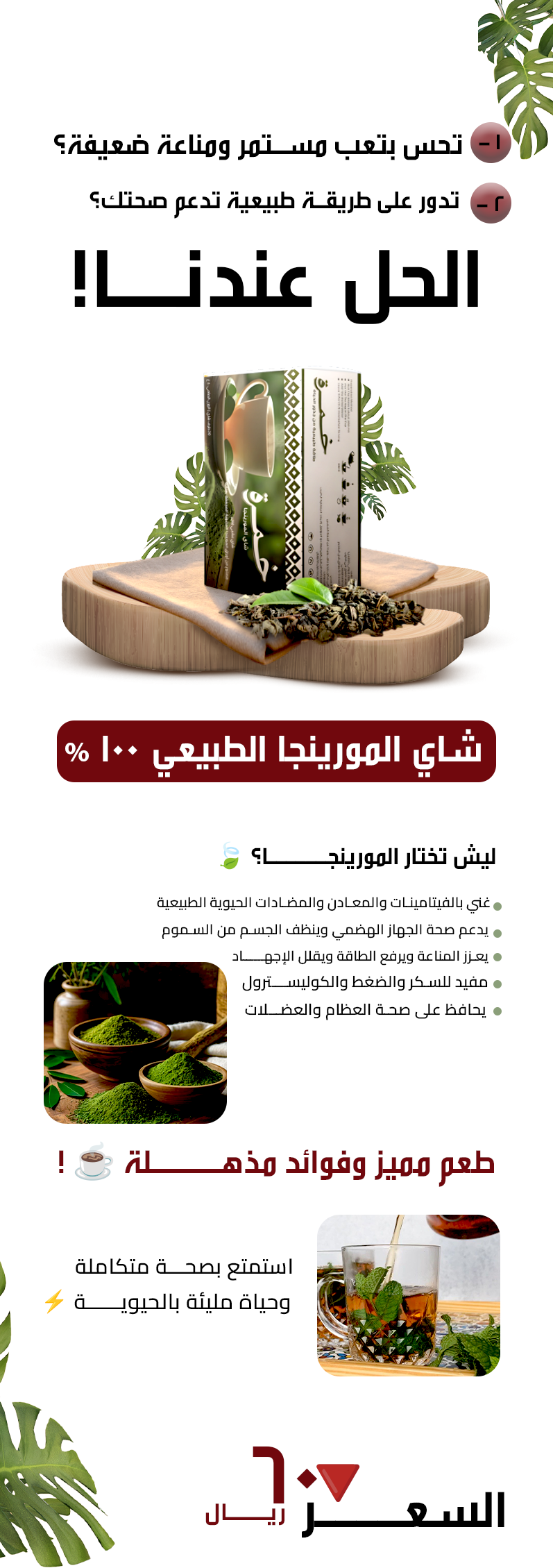 - يحتوي شاي المورينجا على فيتامينات A و C والكالسيوم والبوتاسيوم والحديد، بالإضافة إلى مضادات الأكسدة التي تساعد في مكافحة الجذور الحرة وتقليل خطر الأمراض المزمنة.